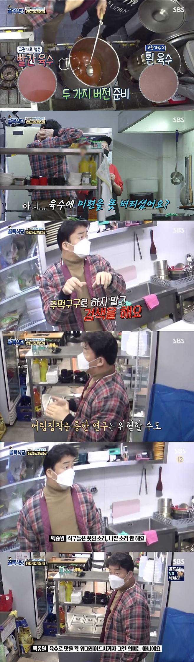 사장님은 고춧가루를 넣은 육수와 넣지 않은 육수 두 가지를 끓였다고 공개했다. 백종원은 육수 상태를 확인하며 "왜 이렇게 진하게 우렸냐. 내가 살짝 끓이라고 하지 않았냐. 이건 사골이잖냐"라고 답답해했다.