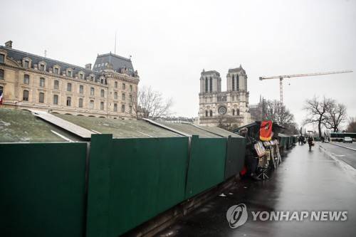 epa08968624 A bookseller stands inside his kiosk as other kiosks are closed, along the Seine river, near Notre-Dame Cathedral in Paris, France, 27 January 2021. Most of bookseller kiosks were closed recently after the number of tourists drastically decreased amid the coronavirus pandemic. EPA/MOHAMMED BADRA