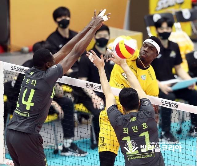 【발리볼코리아닷컴(의정부)=김경수 기자】 27일(수) 경기도 의정부시 의정부체육관에서 열린 프로배구 2020-2021 V리그 5라운드 남자부 KB손해보험 vs 현대캐피탈 의정부경기에서 KB손해보험 케이타의 후위공격을 현대캐피탈 다우디와 최민호가 블로킹 하고 있다. 2021. 1.27.