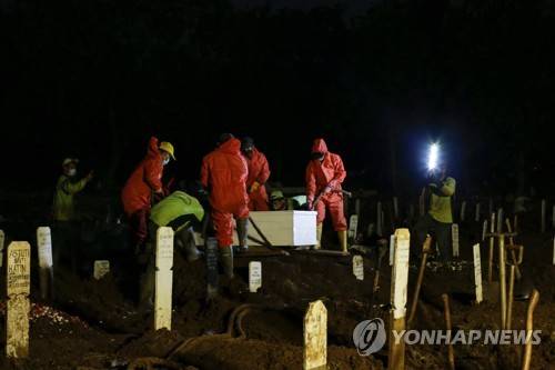 epa08968711 Workers clad in hazmat suits lower the coffin of a Covid-19 victim during a funeral at Bambu Apus Covid-19 dedicated cemetery in Jakarta, Indonesia, 27 January 2021. Indonesia has reported more than one million COVID-19 cases since the beginning of the pandemic, the highest number in Southeast Asia. EPA/MAST IRHAM