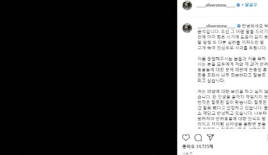 이어 "이번 계기를 통해 또 다른 마음가짐이 생겼고 그 부분을 일깨워주신 모든 분들께 감사를 드린다. 과거에 잘못한 부분 노력해서 더 나은 모습 보여드리도록 노력하겠다"라고 다짐했다.