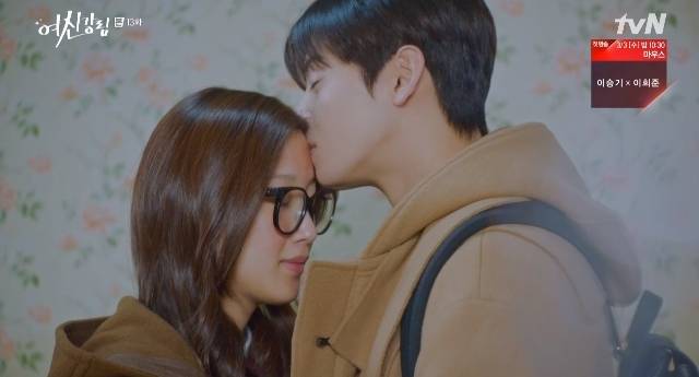 이수호는 이런 임주경의 모습을 만족스럽게 지켜보며 이마에 뽀뽀를 해준 뒤 포옹, 잘했다며 머리를 쓰다듬어 줬다. (사진=tvN '여신강림' 캡처)