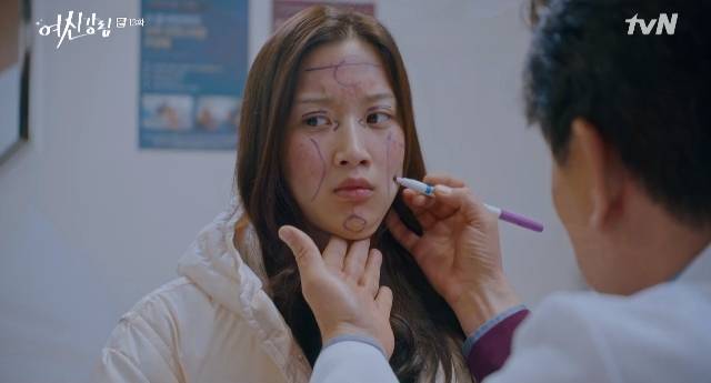 이에 의사(이한위 분)은 매직 하나를 들고 "일단 기본 쌍커풀은 돼 있으니까 비절개 눈매 교정술로 더 또렷하게 만드는 걸로 하자. 앞에 째고 뒤 째고 더 크게 어플 사진처럼. 그리고 코는 실리콘으로 전체 콧대를 살려주고 코 끝은 왼쪽 귀를 절개해서 연골 채취한 다음 오똑하게 만들고"라며 임주경 얼굴에 그림을 그리기 시작했다.