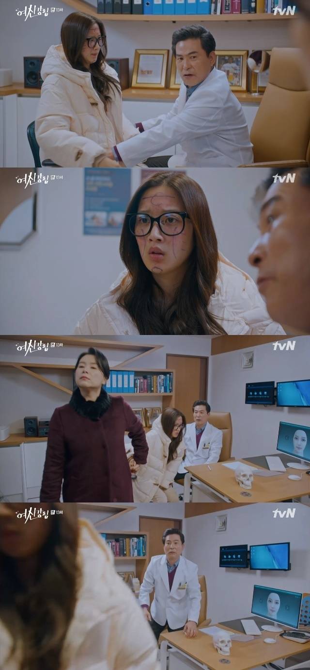 하지만 홍현숙은 지지 않고 "무슨 아파트 재개발 하냐. 째고 깎고 그러면 예뻐지냐. 예쁘고 못생기고 그 기준은 누가 정하냐. 우리딸 내눈엔 예쁘기만 하구만"이라며 성형 후 예상 얼굴에 "화장하면 이 얼굴이더라. 성형술이 화장술만 못하다. 멀쩡한 얼굴에 왜 칼을 대냐"고 일침 후 임주경을 다시 끌고 나갔다. 영화 '미녀는 괴로워' 속 명의로 유명한 이한위와 함께 한 패러디 장면이 시청자들에게 웃음을 자아냈다. (사진=tvN '여신강림' 캡처)