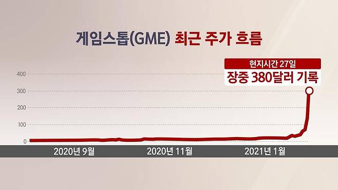 기자가 콕 짚어 전하는 뉴스, 뉴스 픽입니다. 요즘 해외 주식 투자자들 사이에 가장 큰 화두는 게임스톱 주가죠. 최근 며칠 동안 수직 상승하면서 경이적인 상승률을 기록했는데요. 개인투자자들과 대형 헤지펀드 간 경쟁으로도 관심을 받고 있는데, 주가가 너무 오르다 보니 시장 조작설까지 나오고 있습니다. 장가희 기자, 게임스톱 열풍이 정말 무섭더군요.