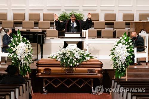 epa08970125 A handout photo made available by the Atlanta Braves showing Pastor Richard W. Wills, Sr. prays during funeral services for Henry 'Hank' Aaron, longtime Atlanta Braves player and Hall of Famer at Friendship Baptist Church in Atlanta, Georgia, USA, 27 January 2021. EPA/KEVIN D. LILES / ATLANTA BRAVES / HANDOUT HANDOUT EDITORIAL USE ONLY/NO SALES
