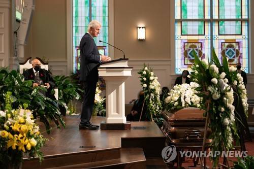 epa08970131 A handout photo made available by the Atlanta Braves showing Former President Bill Clinton speaks during funeral services for Henry 'Hank' Aaron, longtime Atlanta Braves player and Hall of Famer at Friendship Baptist Church in Atlanta, Georgia, USA, 27 January 2021. EPA/KEVIN D. LILES / ATLANTA BRAVES / HANDOUT HANDOUT EDITORIAL USE ONLY/NO SALES