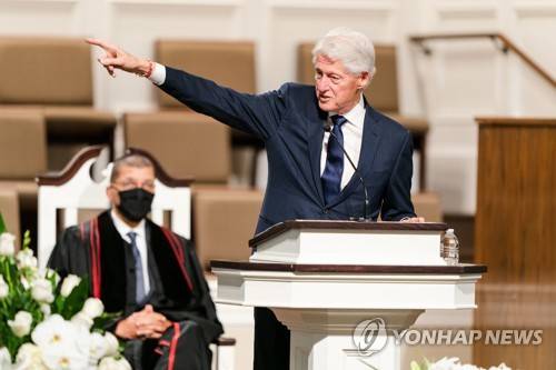 epa08970141 A handout photo made available by the Atlanta Braves showing Former President Bill Clinton speaks during funeral services for Henry 'Hank' Aaron, longtime Atlanta Braves player and Hall of Famer at Friendship Baptist Church in Atlanta, Georgia, USA, 27 January 2021. EPA/KEVIN D. LILES / ATLANTA BRAVES / HANDOUT HANDOUT EDITORIAL USE ONLY/NO SALES