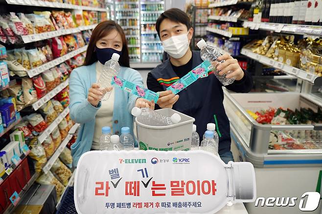 (서울=뉴스1) = 편의점 세븐일레븐은 친환경 시대 올바른 자원선순환 활동을 응원하는 국민 공감 캠페인 ‘라떼는 말이야’를 전개한다고 28일 밝혔다. 모델들이 세븐일레븐 매장에서 라벨을 뗀 페트병을 선보이며 캠페인을 알리고 있다. ‘라떼는 말이야’ 캠페인은 ‘라벨떼기는 말이야’의 줄임말로 일상 생활에서 페트병을 올바르게 버리는 방법을 알리고 동참을 유도하는 자원선순환 생활문화 정착 활동이다. 세븐일레븐은 환경부의 투명 페트병 별도 분리배출 홍보 스티커를 전국 모든 가맹점의 워크인쿨러 냉장고(WIC) 페트음료 코너에 부착한다.(세븐일레븐 제공) 2021.1.28/뉴스1