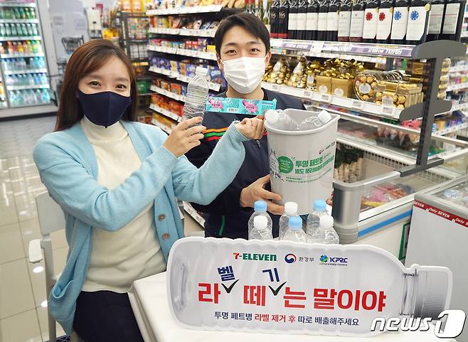 (서울=뉴스1) = 편의점 세븐일레븐은 친환경 시대 올바른 자원선순환 활동을 응원하는 국민 공감 캠페인 ‘라떼는 말이야’를 전개한다고 28일 밝혔다. 모델들이 세븐일레븐 매장에서 라벨을 뗀 페트병을 선보이며 캠페인을 알리고 있다. ‘라떼는 말이야’ 캠페인은 ‘라벨떼기는 말이야’의 줄임말로 일상 생활에서 페트병을 올바르게 버리는 방법을 알리고 동참을 유도하는 자원선순환 생활문화 정착 활동이다. 세븐일레븐은 환경부의 투명 페트병 별도 분리배출 홍보 스티커를 전국 모든 가맹점의 워크인쿨러 냉장고(WIC) 페트음료 코너에 부착한다.(세븐일레븐 제공) 2021.1.28/뉴스1