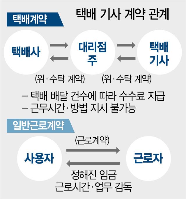 과로사를 해결하기 위해 택배 기사의 계약 방식을 근로계약으로 전환하고 택배 기사를 더 뽑으면 되지만 노사 모두 이 문제에 대해 언급하지 않는다. 근로계약서에는 정해진 임금과 근로시간이 명시되고 주 52시간 근로제 등 근로기준법의 보호도 받을 수 있다. 하지만 이 경우 택배 기사의 임금은 줄어든다. CJ대한통운의 경우 월 500만 원 이상의 수익을 올리는 사례가 심심치 않게 발견되지만 근로계약이 원칙인 쿠팡의 경우는 인센티브를 더해도 연 4,800만 원을 넘기 힘들다. 택배사와 대리점주는 계약 변경 후 노무관리에 드는 추가 비용을 꺼린다. 근로계약 체결 이후에는 연장근로수당·연차휴가·퇴직급여 등의 부수적 지출이 늘어나기 때문이다.