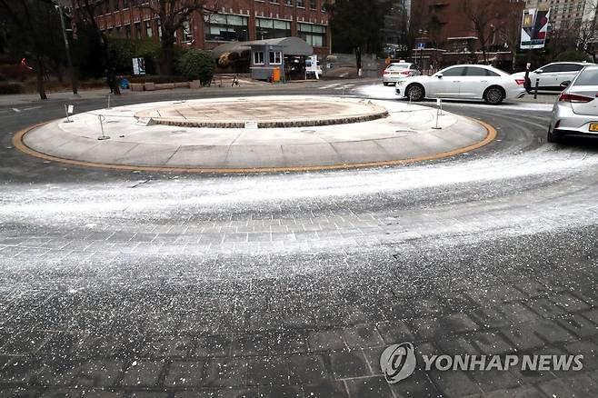 (서울=연합뉴스) 백승렬 기자 = 서울과 경기 북부에 28일 대설주의보가 내려지자 이날 오전 8시께 염화칼슘이 하얗게 뿌려진 서울 정동길에서 직장인들과 차량이 지나고 있다.