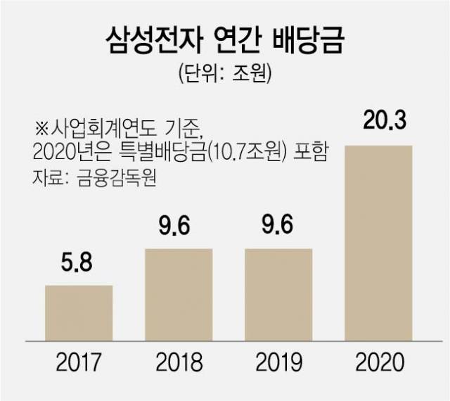 삼성전자(005930)가 지난해 결산 배당으로 총 13조 원을 푼 데 이어 향후 3년간 정규 배당 규모를 연간 9조 8,000억 원으로 확대한다.