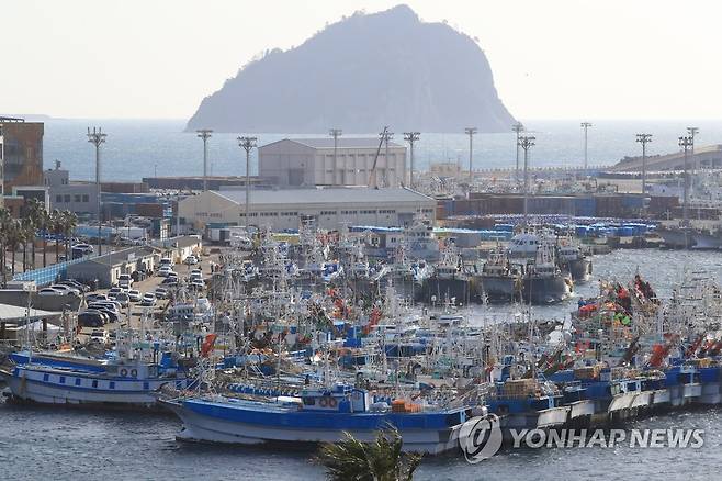 (서귀포=연합뉴스) 박지호 기자 = 제주도 앞바다 전역에 28일 정오를 기해 풍랑주의보가 내려진 가운데 이날 오전 어선들이 서귀포항으로 대피하고 있다. 2021.1.28