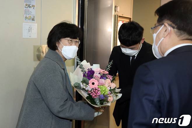 (서울=뉴스1) 황기선 기자 = 정영애 여성가족부 장관이 28일 오전 서울 서대문구 한국청소년활동진흥원에서 꽃다발을 받고 있다. 2021.1.28/뉴스1