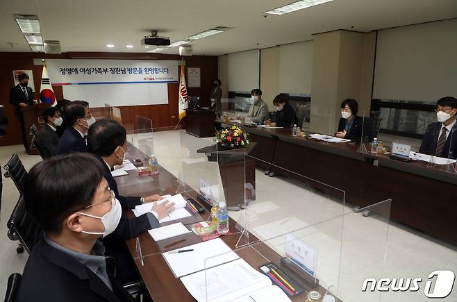 (서울=뉴스1) 황기선 기자 = 정영애 여성가족부 장관이 28일 오전 서울 서대문구 한국청소년활동진흥원에서 열린 간담회에서 인사말을 하고 있다. 2021.1.28/뉴스1