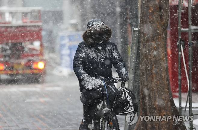(서울=연합뉴스) 김인철 기자 = 서울과 경기북부에 대설주의보가 내려진 28일 오전 서울 중구 명동 일대에 눈이 내리고 있다. 2021.1.28