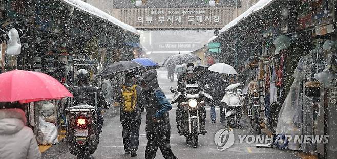 (서울=연합뉴스) 류영석 기자 = 서울·경기북부 지역에 대설주의보가 내려진 28일 오전 서울 중구 동대문 평화시장에서 시민들이 상점 앞을 지나고 있다. 2021.1.28