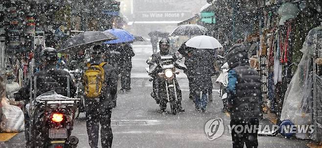 (서울=연합뉴스) 류영석 기자 = 서울·경기북부 지역에 대설주의보가 내려진 28일 오전 서울 중구 동대문 평화시장에서 시민들이 상점 앞을 지나고 있다. 2021.1.28
