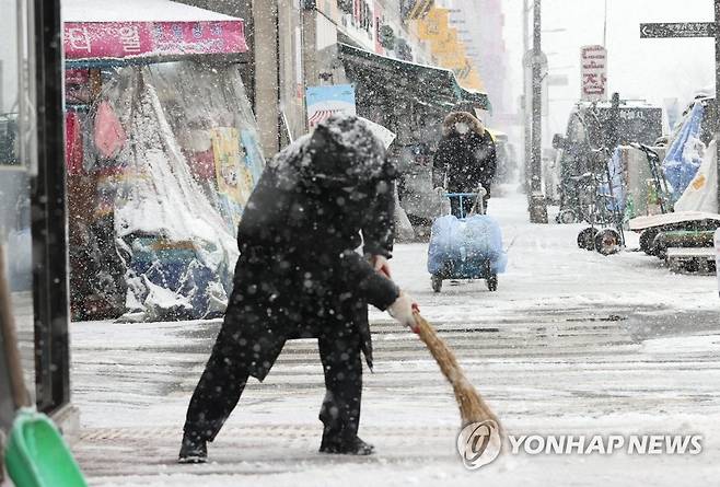 (서울=연합뉴스) 류영석 기자 = 서울·경기북부 지역에 대설주의보가 내려진 28일 오전 서울 중구 동대문 평화시장에서 관계자가 쌓인 눈을 쓸고 있다. 2021.1.28