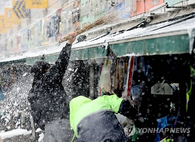 (서울=연합뉴스) 류영석 기자 = 서울·경기북부 지역에 대설주의보가 내려진 28일 오전 서울 중구 동대문 평화시장에서 상인이 상점 천막에 쌓인 눈을 쓸어내리고 있다. 2021.1.28