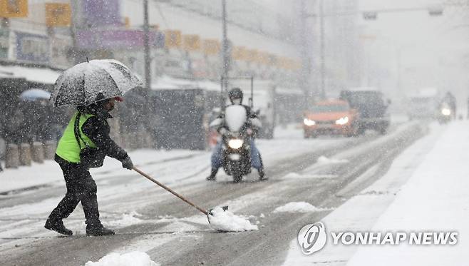 (서울=연합뉴스) 류영석 기자 = 서울·경기북부 지역에 대설주의보가 내려진 28일 오전 서울 중구 동대문 평화시장 앞을 오토바이가 지나가고 있다. 2021.1.28