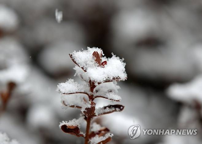 (서울=연합뉴스) 김도훈 기자 = 서울과 경기북부에 대설주의보가 내려진 28일 오전 서울 서초구 서울중앙지법에서 화단에 눈꽃이 피어있다. 2021.1.28