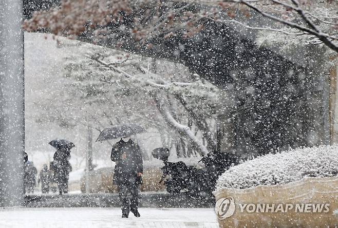 (서울=연합뉴스) 김도훈 기자 = 서울과 경기북부에 대설주의보가 내려진 28일 오전 서울 서초구 서울중앙지법에서 시민들이 눈을 맞으며 길을 지나고 있다. 2021.1.28