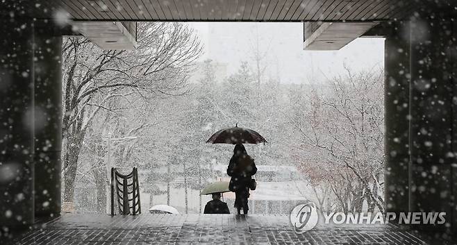 (서울=연합뉴스) 김도훈 기자 = 서울과 경기북부에 대설주의보가 내려진 28일 오전 서울 서초구 서울중앙지법에서 시민들이 눈을 맞으며 길을 지나고 있다. 2021.1.28