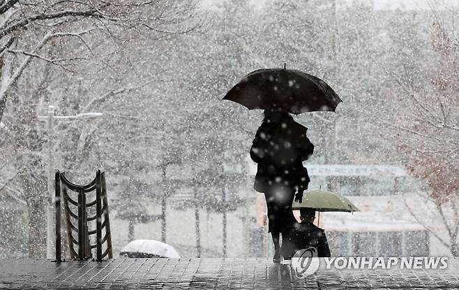 (서울=연합뉴스) 김도훈 기자 = 서울과 경기북부에 대설주의보가 내려진 28일 오전 서울 서초구 서울중앙지법에서 시민들이 눈을 맞으며 길을 지나고 있다. 2021.1.28