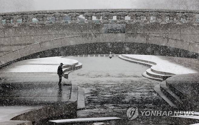 (서울=연합뉴스) 류영석 기자 = 서울·경기북부 지역에 대설주의보가 내려진 28일 오전 서울 청계천 모전교 밑에서 한 시민이 눈을 피해 운동을 하고 있다. 2021.1.28