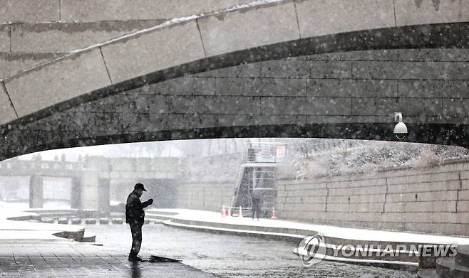 (서울=연합뉴스) 류영석 기자 = 서울·경기북부 지역에 대설주의보가 내려진 28일 오전 서울 청계천 모전교 밑에서 한 시민이 눈을 피해 운동을 하고 있다. 2021.1.28