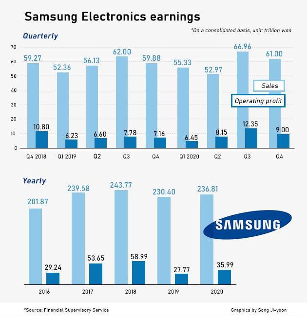 Its IT and mobile communications division reported 2.42 trillion won in operating income on sales of 22.34 trillion won. Both revenue and profit fell on quarter on intensifying competition with the launch of Apple Inc.’s new iPhone 12 and higher marketing expenses in the year end.