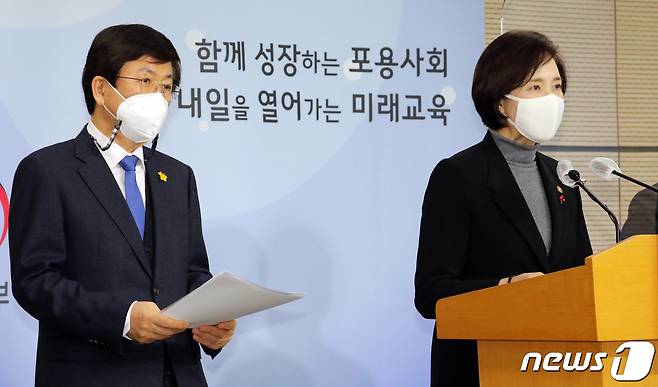 (세종=뉴스1) 장수영 기자 = 유은혜 사회부총리 겸 교육부 장관이 28일 정부세종청사 교육부 브리핑실에서 '2021년 학사 및 교육과정 운영 지원방안' 브리핑을 하고 있다. 왼쪽은 최교진 전국시도교육감협의회(세종시교육감).