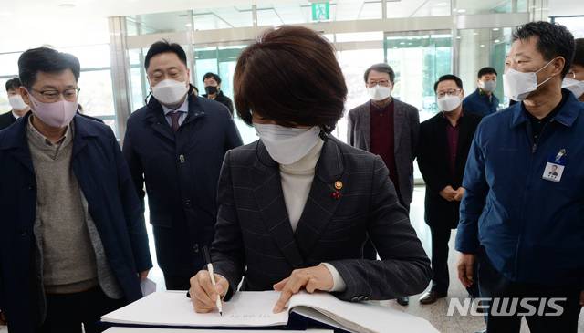 [완주=뉴시스] 김얼 기자 = 한정애 환경부 장관이 28일 전북 완주군 현대자동차 전주공장을 방문해 방명록에 서명하고 있다. 한정애 환경부 장관은 취임 후 첫 현장 행보인 '한국판 뉴딜 대표사업 무공해차 보급사업 현장 방문'으로 현대자동차 전주공장을 방문 했다. 2021.01.28.