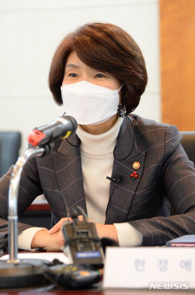 [완주=뉴시스] 김얼 기자 = 한정애 환경부 장관이 28일 전북 완주군 현대자동차 전주공장을 방문해 인사말을 하고 있다. 한정애 환경부 장관은 취임 후 첫 현장 행보인 '한국판 뉴딜 대표사업 무공해차 보급사업 현장 방문'으로 현대자동차 전주공장을 방문 했다. 2021.01.28.