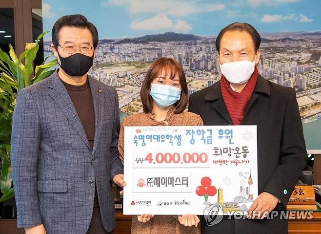 사진은 용산구청에서 열린 장학금 전달식에 참석한 성장현 용산구청장(왼쪽부터)과 판티 응옥 브이 퀴논시 숙대 유학생 대표, 윤재갑 제이마스터 대표. 2021.1.28