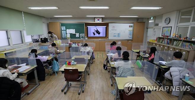 (서울=연합뉴스) 최재구 기자 = 유은혜 사회부총리 겸 교육부 장관이 2021학년도 학사 및 교육과정 운영 지원방안 등을 발표한 28일 서울 용원초등학교에서 학생들이 수업하고 있다. 2021.1.28