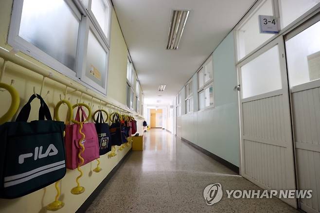 (서울=연합뉴스) 최재구 기자 = 유은혜 사회부총리 겸 교육부 장관이 2021학년도 학사 및 교육과정 운영 지원방안 등을 발표한 28일 서울 용원초등학교 복도에 학생들의 실내와 가방이 걸려 있다. 2021.1.28