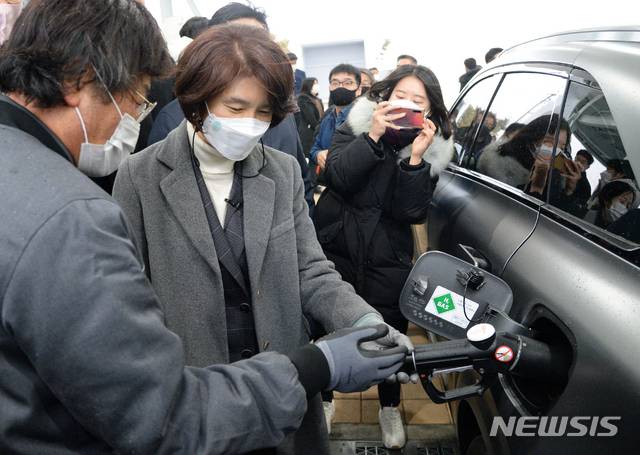 [완주=뉴시스] 김얼 기자 = 한정애 환경부 장관이 28일 전북 완주군 수소충전소를 방문해 차량에 수소 충전을 시연하고 있다. 한정애 환경부 장관은 취임 후 첫 현장 행보인 '한국판 뉴딜 대표사업 무공해차 보급사업 현장 방문'으로 현대자동차 전주공장과 수소충전소를 방문 했다. 2021.01.28.