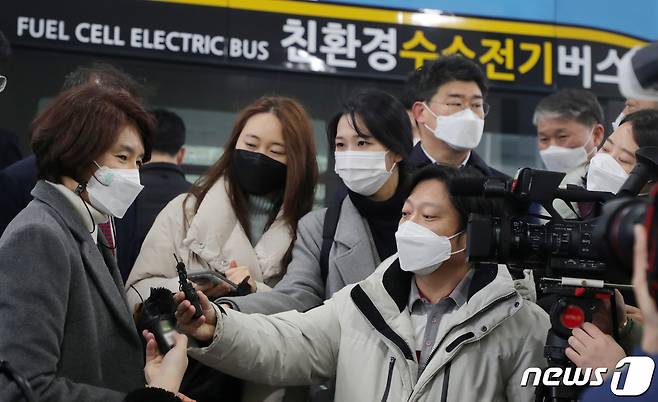 (완주=뉴스1) 유경석 기자 = 한정애 환경부 장관(왼쪽)이 28일 전북 완주군 수소충전소에서 취재진의 질의에 답변을 하고 있다. 2021.1.28/뉴스1