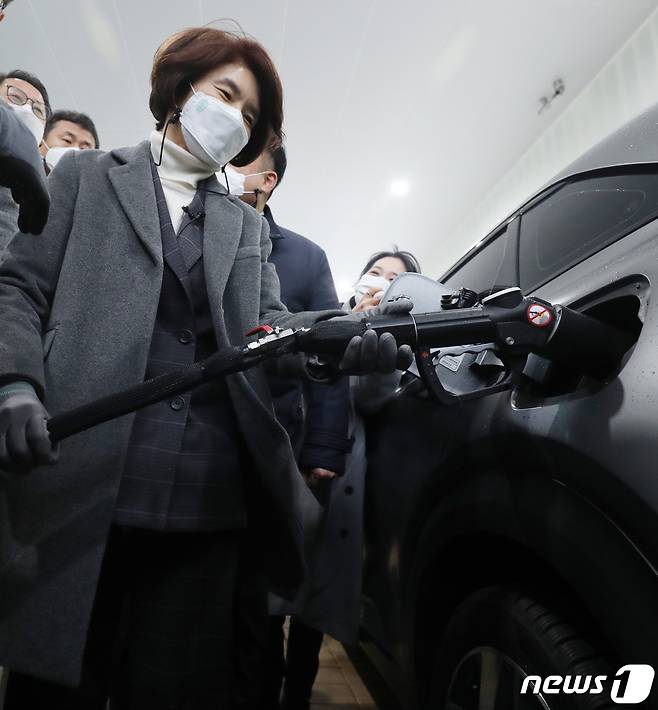 (완주=뉴스1) 유경석 기자 = 한정애 환경부 장관이 28일 전북 완주군 수소충전소를 찾아 수소승용차 충전 시연을 하고 있다. 2021.1.28/뉴스1