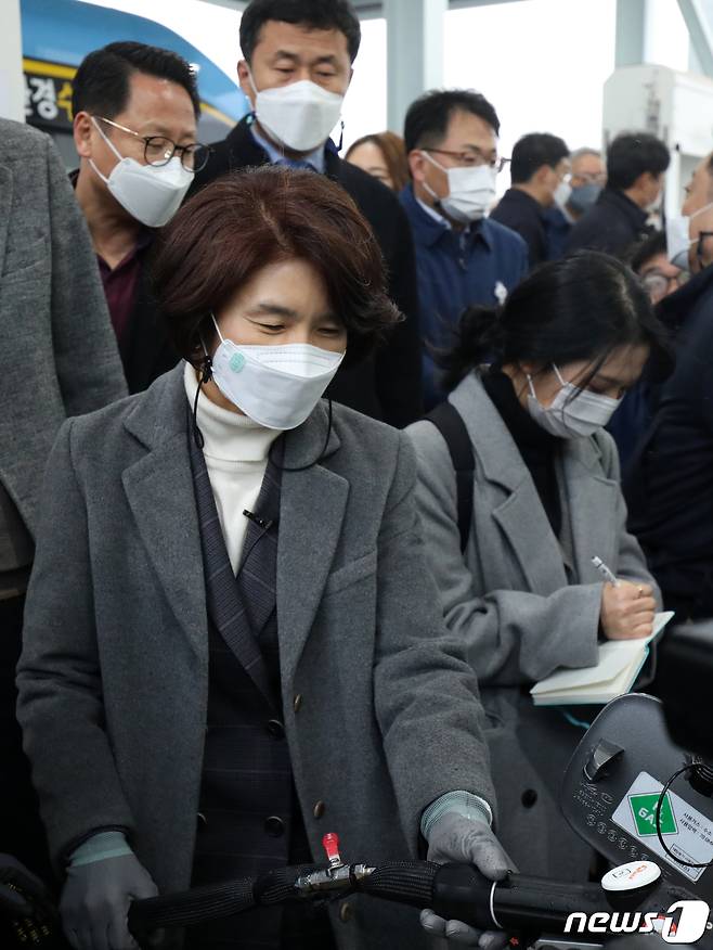 (완주=뉴스1) 유경석 기자 = 한정애 환경부 장관이 28일 전북 완주군 수소충전소를 찾아 수소승용차 충전 시연을 하고 있다. 2021.1.28/뉴스1