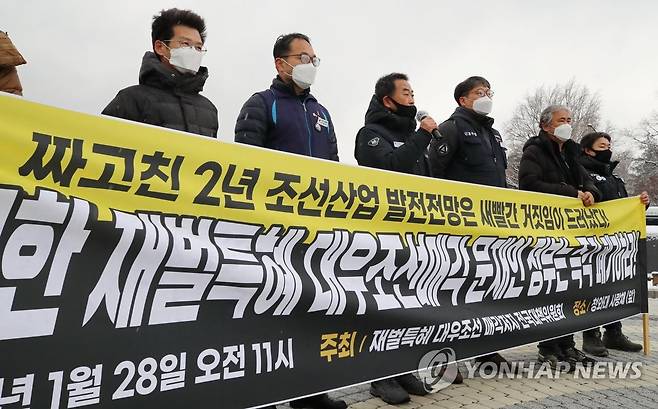 (서울=연합뉴스) 이재희 기자 = 28일 오전 청와대 분수대 앞에서 민주노총 금속노조 등 단체 회원들이 대우조선 매각 폐기 촉구 기자회견을 하고 있다. 2021.1.28