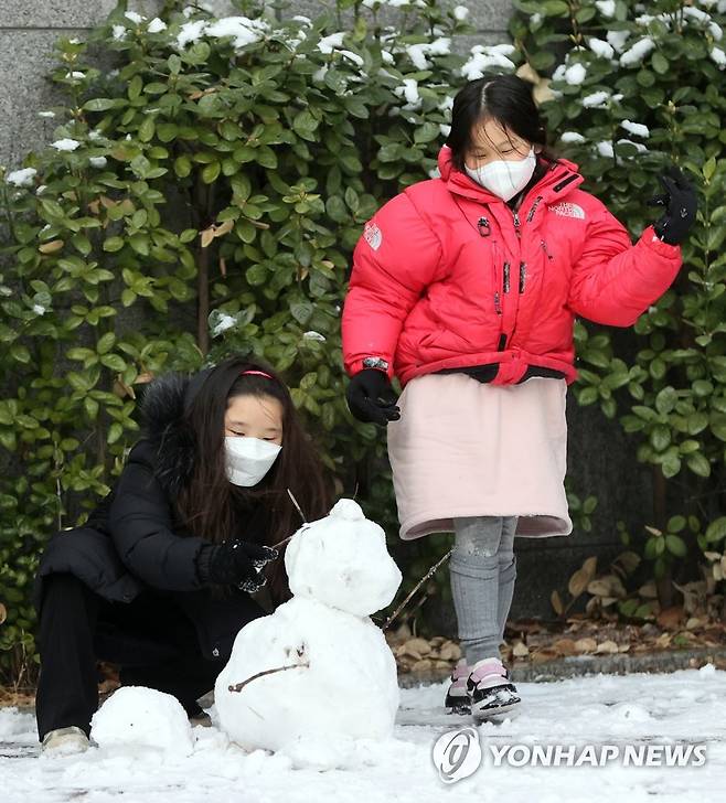 (서울=연합뉴스) 최재구 기자 = 눈이 내린 28일 서울 성북구 한 아파트 단지에서 어린이들이 눈사람을 만들며 즐거워하고 있다. 2021.1.28