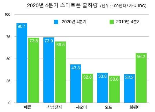 IDC는 이날 4분기 전체 스마트폰 출하량이 전년 같은 기간보다 4.3% 늘어난 3억8천590만대로 집계됐다고 밝혔다. 스마트폰 판매량이 늘어난 것은 ▲5G 지원 ▲공격적인 마케팅 ▲중저가 제품 인기 등 때문이라고 IDC가 설명했다.