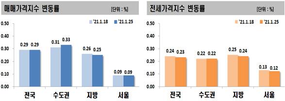 한국부동산원은 1월 넷째 주(25일 기준) 전국의 아파트 매매가격이 0.29% 올라 전주와 같은 상승률을 보였다고 28일 밝혔다.