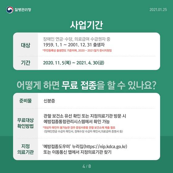 · 무료대상 확인방법 : 관할 보건소 유선 확인 또는 지정의료기관 방문 시 예방접종통합관리시스템에서 확인 가능