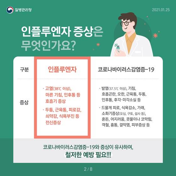 인플루엔자는 코로나19와 증상이 유사하기 때문에 철처한 예방이 필요합니다.