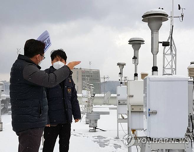 (서울=연합뉴스) 28일 국립환경과학원 소속의 서울 은평구 소재 수도권대기환경연구소를 방문한 안세창 수도권대기환경청장(오른쪽)이 담당 연구관으로부터 '대기질 측정 장비'에 대한 설명을 듣고 있다. 2021.1.28